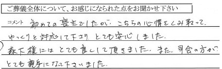 大変お世話になり、初めての経験でしたので不安でしたが慌てることもなく、 スムーズに進み、疲れも感じず感謝してます。 スタッフの方もやさしく気持ちよく葬儀ができました。 彼は細かいことによく気が付く方です。 1つ1つ説明をして下さり、有難かったです。