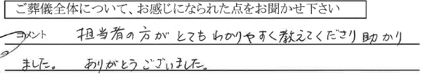 ありがとうございました。事前・事後も含めとてもわかりやすく親切に対応いただきました。諸々の説明も非常にわかりやすく、葬儀の実施だけでなく、細やかに対応して頂けたことに感謝です。永久保存版の「仏事の心得と~」は、とても助かっています。