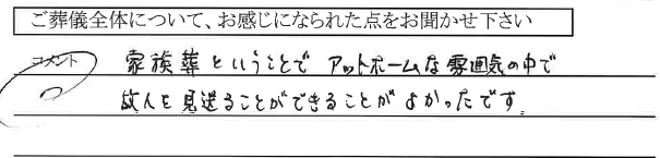 家族葬ということでアットホームな雰囲気の中で故人を見送ることができることがよかったです。