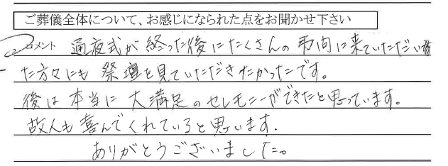 通夜式が終わった後にたくさんの弔問に来ていただいた方々にも祭壇を見ていただきたかったです。あとは本当に大満足のセレモニーができたと思っています。故人も喜んでくれていると思います。ありがとうございました。