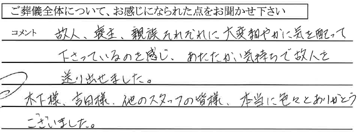 分からない事が多い中、こちらの質問にていねいに答えて頂いたり、 子供達にもやさしく対応して頂き、心置きなく故人を見送ることができました。 ありがとうございました。