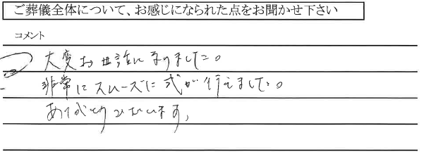 大変お世話になり、初めての経験でしたので不安でしたが慌てることもなく、 スムーズに進み、疲れも感じず感謝してます。 スタッフの方もやさしく気持ちよく葬儀ができました。 彼は細かいことによく気が付く方です。 1つ1つ説明をして下さり、有難かったです。
