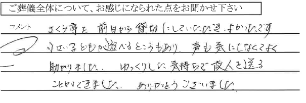 分からない事が多い中、こちらの質問にていねいに答えて頂いたり、 子供達にもやさしく対応して頂き、心置きなく故人を見送ることができました。 ありがとうございました。