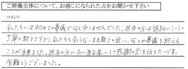 私たちには初めての葬儀で何も分かりませんでした。担当の方は詳細に一つ一つ丁寧に教えて下さり、私たちも分らないまま教えに従い、何とか葬儀を終えることが出来ました。担当の方に今一度お逢いして感謝の念を伝えたいです。有難うございました。