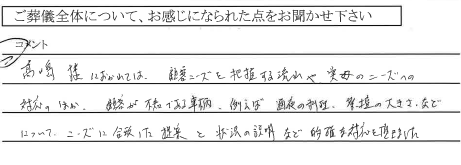 こちらの希望をきいていただき、よい思い出となる葬儀となりました。ありがとうございました。