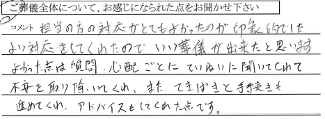 大変お世話になり、初めての経験でしたので不安でしたが慌てることもなく、 スムーズに進み、疲れも感じず感謝してます。 スタッフの方もやさしく気持ちよく葬儀ができました。 彼は細かいことによく気が付く方です。 1つ1つ説明をして下さり、有難かったです。