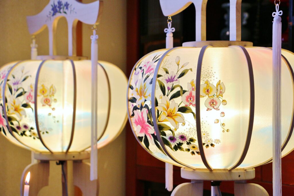 今は見かけない装飾品・装具というと、「回転灯篭」や「くす玉」、「箒(ほうき)」などがあります。回転灯篭は、あの世に行く道のりを照らす灯り。ロウソクと同じような意味があります。くす玉は鳥居形をした木枠の中央に玉が吊るされているもので、祭壇の両側に飾られます。回転灯篭は初盆にも利用され、迎え火といった役割も。