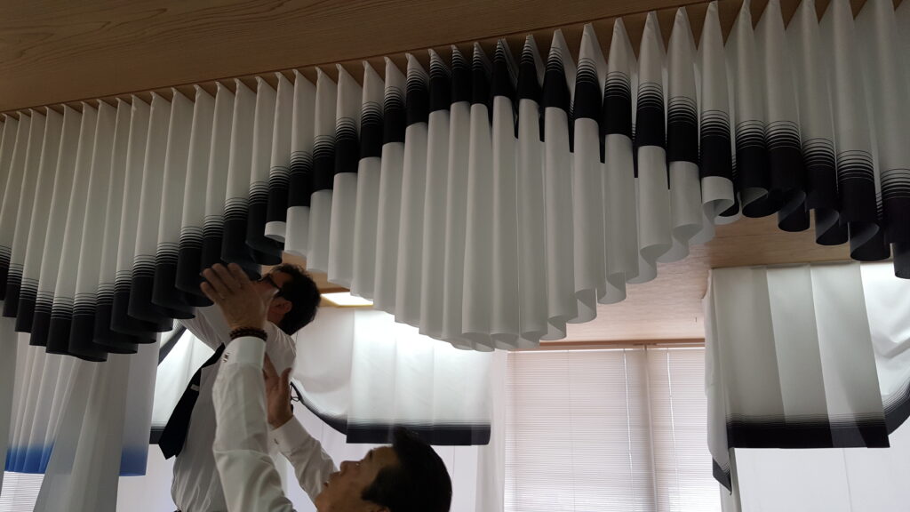 幕張りは一人で行います。1枚ものの布を天井から吊るし、幾重にもひだを重ね、円形状のシャンデリアのように形作ることもあれば、放射線状に四方へひだを連ね装飾することもあります。左右対称なのが美しさの秘訣で、難しいポイントでもあります。下書きや仮留めはなく、私の頭の中にある完成図をもとに、仕上げていきます。費用によって使用できる幕の長さが違いますので、その時々で形は異なりますが、私の感性でできる限りの装飾を施していました。お部屋の様子を見れば必要な布の長さが分かりますし、仕上がりのイメージも浮かびます。参列された方々に「すごいなあ」とお言葉をいただくこともありました。