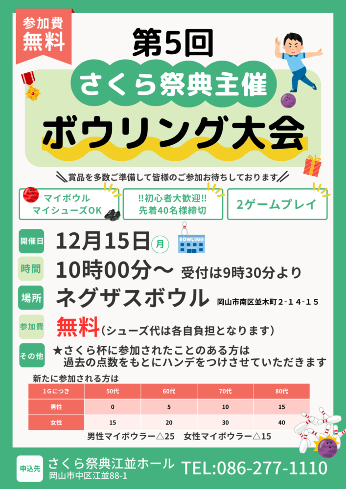 2025年11月19日 その他イベント 江並 12/15★ボウリング大会を開催します(江並) 第5回さくら杯ボウリング大会を開催いたします! 日時:12月15日(月) 10時00分~ (受付は9時30分より) 場所:ネグザスボウル 参加費:無料!! シューズ代は各自負担になります その他:マイボール・マイシューズOK 初心者の方も大歓迎です 皆様のご参加お待ちしております🎳✨