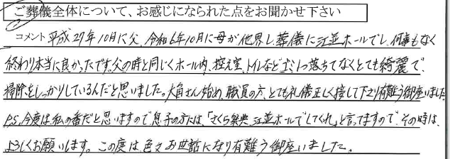 平成27年10月に父、令和6年に10月に母が他界し、葬儀に江並ホールでし、何事もなく終わり、本当に良かったです。父の時と同じくホール内、控え室、トイレなどゴミ1つ落ちてなく、とても綺麗で掃除をしっかりしているんだと思いました。大角さん始め、職員の方、とても礼儀正しく接して下さり有難う御座いました。 P.S.今度は私の番だと思いますので息子の方には、「さくら祭典江並ホールでしてくれ」と言ってますので、その時は、よろしくお願いします。この度は色々お世話になり有難う御座いました。