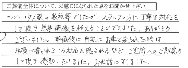 少人数の家族葬でしたが、スタッフの方に丁寧な対応をして頂き、無事葬儀を終えることができました。葬儀後に自宅にお車で来られた時は、車横に書かれている社名を隠されるなど、ご近所へのご配慮もして頂き、感動いたしました。お世話になりました。