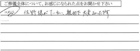 大変お世話になり、初めての経験でしたので不安でしたが慌てることもなく、 スムーズに進み、疲れも感じず感謝してます。 スタッフの方もやさしく気持ちよく葬儀ができました。 彼は細かいことによく気が付く方です。 1つ1つ説明をして下さり、有難かったです。