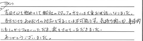 吉田さんを始めとして御社のスタッフの方々には大変お世話になりました。当方だけであれだけの対応をすることは不可能です。気持ち的にも、身体的にもしっかりフォローいただき、楽をさせていただきました。ありがとうございました。