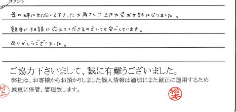 母の時に対応して下さった大角さんにまた大変お世話になりました。親身に相談に答えてくださるのでいつも安心しています。ありがとうございました。