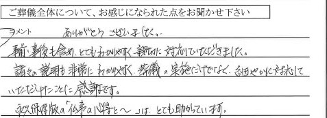 ありがとうございました。事前・事後も含めとてもわかりやすく親切に対応いただきました。諸々の説明も非常にわかりやすく、葬儀の実施だけでなく、細やかに対応して頂けたことに感謝です。永久保存版の「仏事の心得と~」は、とても助かっています。