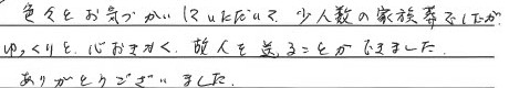 こちらの希望をきいていただき、よい思い出となる葬儀となりました。ありがとうございました。