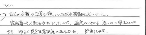前回の花田さまを始めとする皆様のご対応、 今回の川口さまのご対応、すべてにおきましてとても満足しております。 今回は私の父の葬儀でしたが、父との別れに式についても 司会をはじめとする皆様のご丁寧な対応のおかげで しっかりとしたものになりました。大変ありがとうございました。