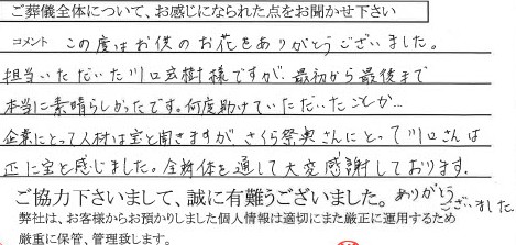 この度はお供のお花をありがとうございました。担当いただいた川口宏樹様ですが、最初から最後まで本当に素晴らしかったです。何度助けていただいたことか…。